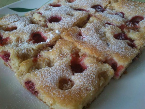 Vylej na plech vyložený pečícím papírem, přidej ovoce, posypku a peč přibližně 25 minut.